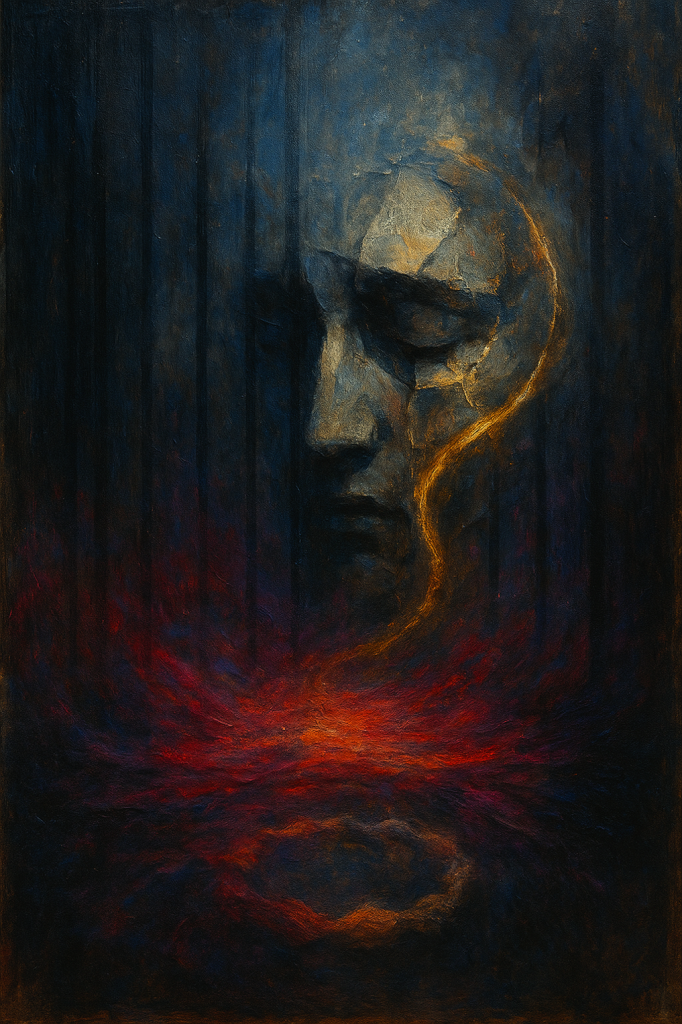 Alt-text. Peinture abstraite sombre, traversée de barres verticales ; une spirale lumineuse or/ambre fend les barres au centre, tandis que des rouges profonds se massent en bas.
