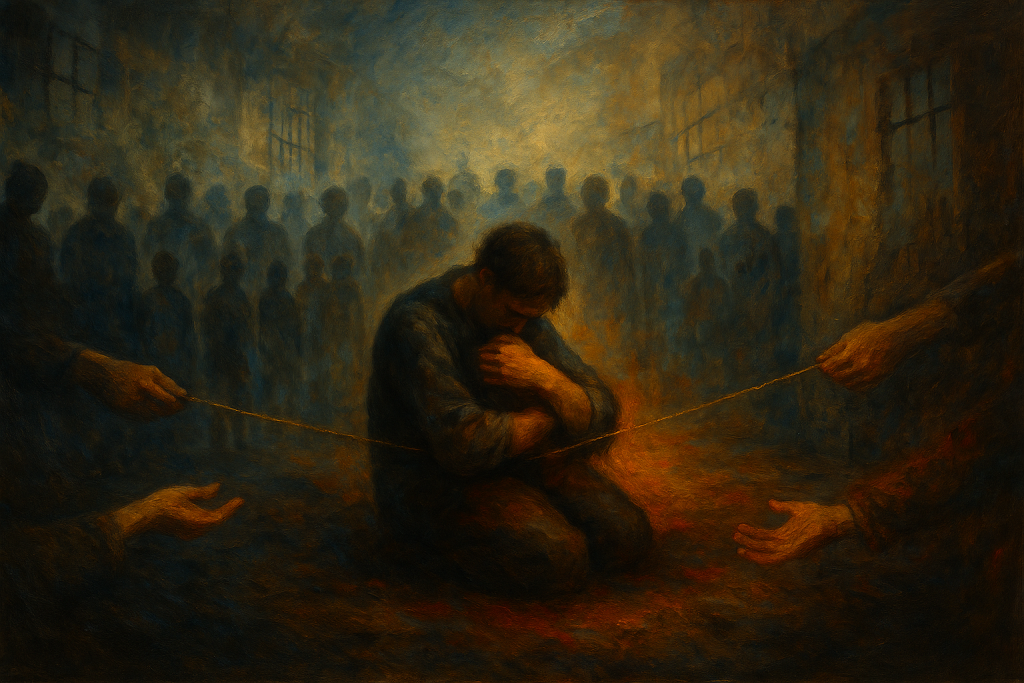 Alt-text (accessibilité). Dans une brume bleue, un personnage recroquevillé serre un fil doré tendu par des mains venues des bords ; autour, des murs fissurés projettent des ombres de grilles.