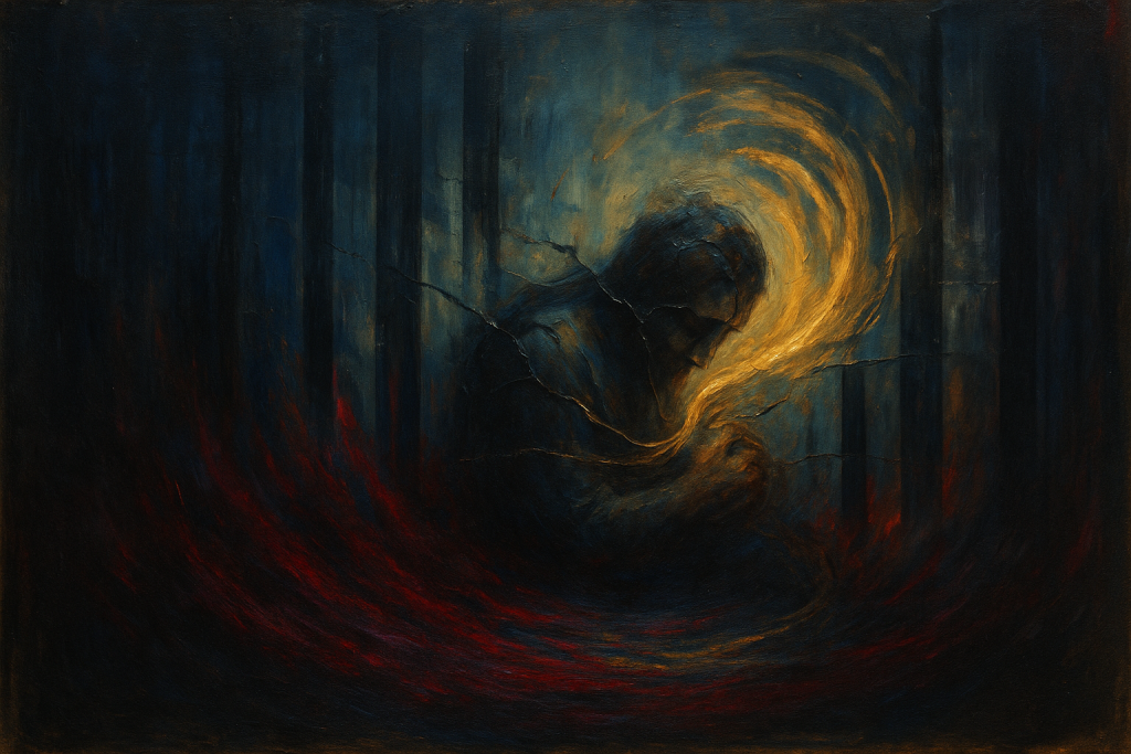 Langage plastique. Clair-obscur à la Rembrandt, diagonale gauche sombre → droite lumière (cheminement). Impasto pour les zones denses, lueur or/ambre qui repousse le froid. On entend presque le silence.