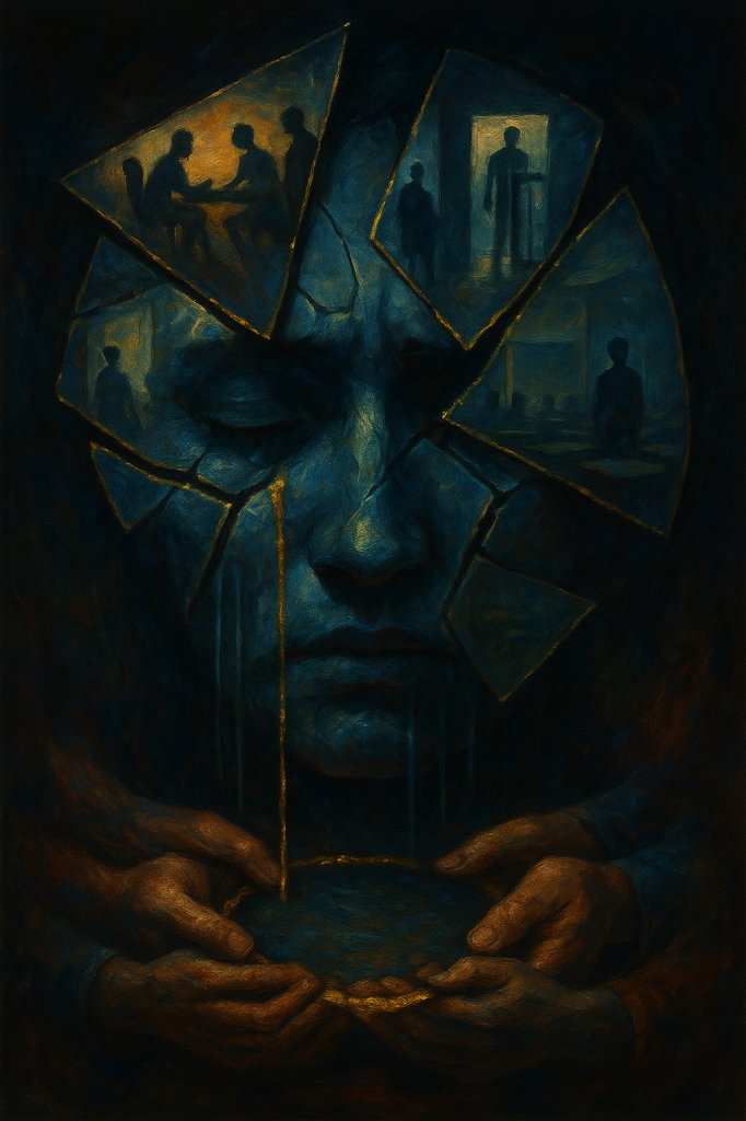 Alt-text. Un visage bleu-vert, fendu en éclats ; dans les fragments, des scènes floues (entretien, contrôle, classe). Des larmes dorées coulent vers un cercle de mains qui se tiennent.